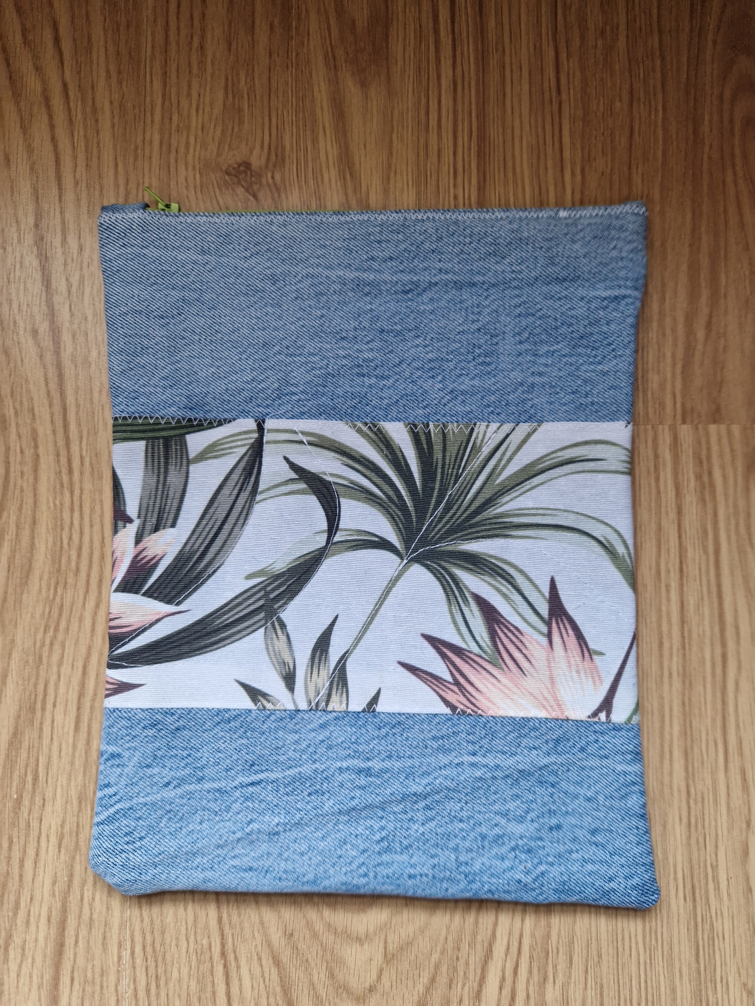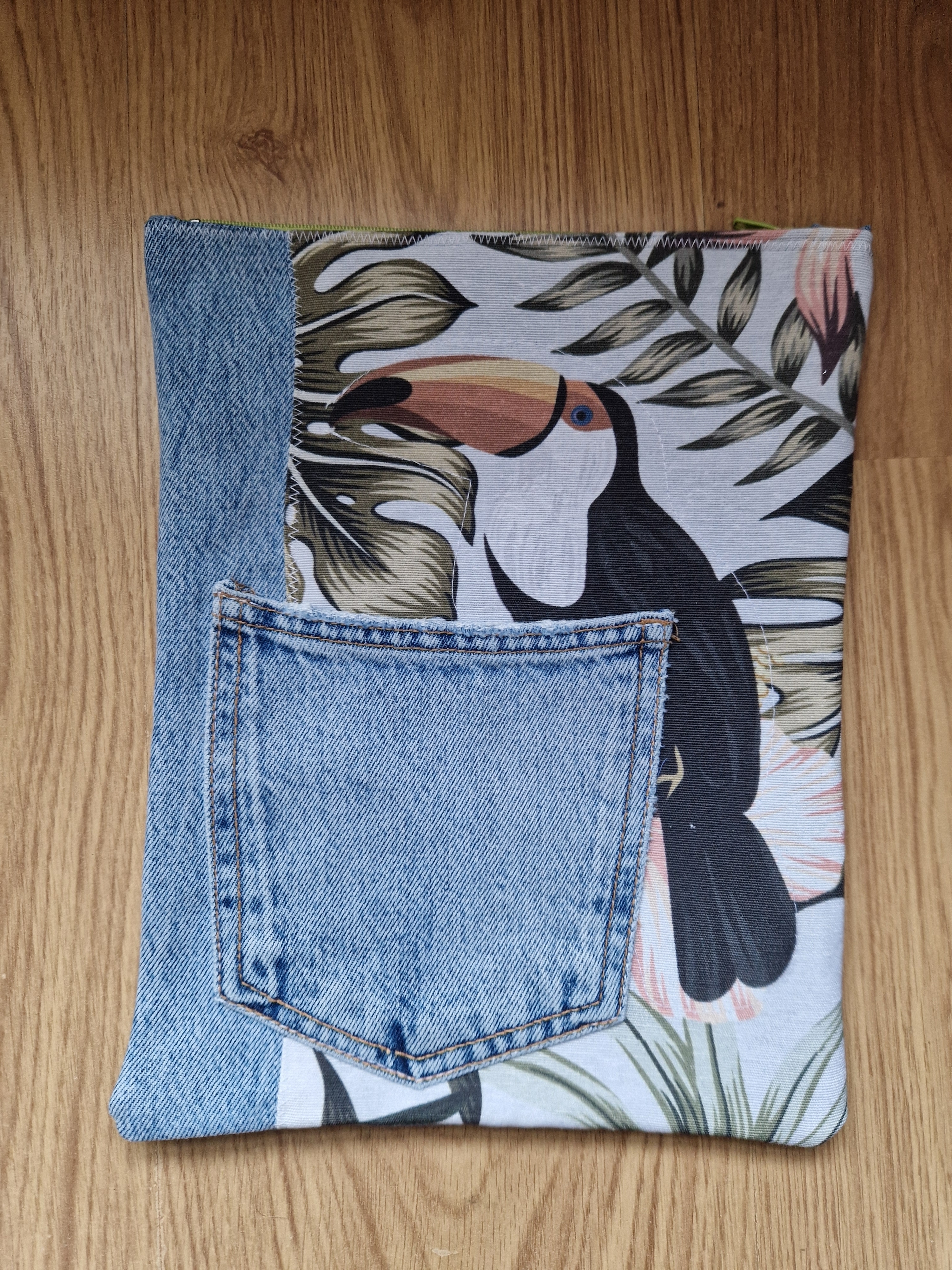 Book Sleeve / E-reader Sleeve/ Tablet Hoes met ritssluitng gemaakt van een lichtblauwe jeans, gecombineerd met een canvas stof met een toekan.