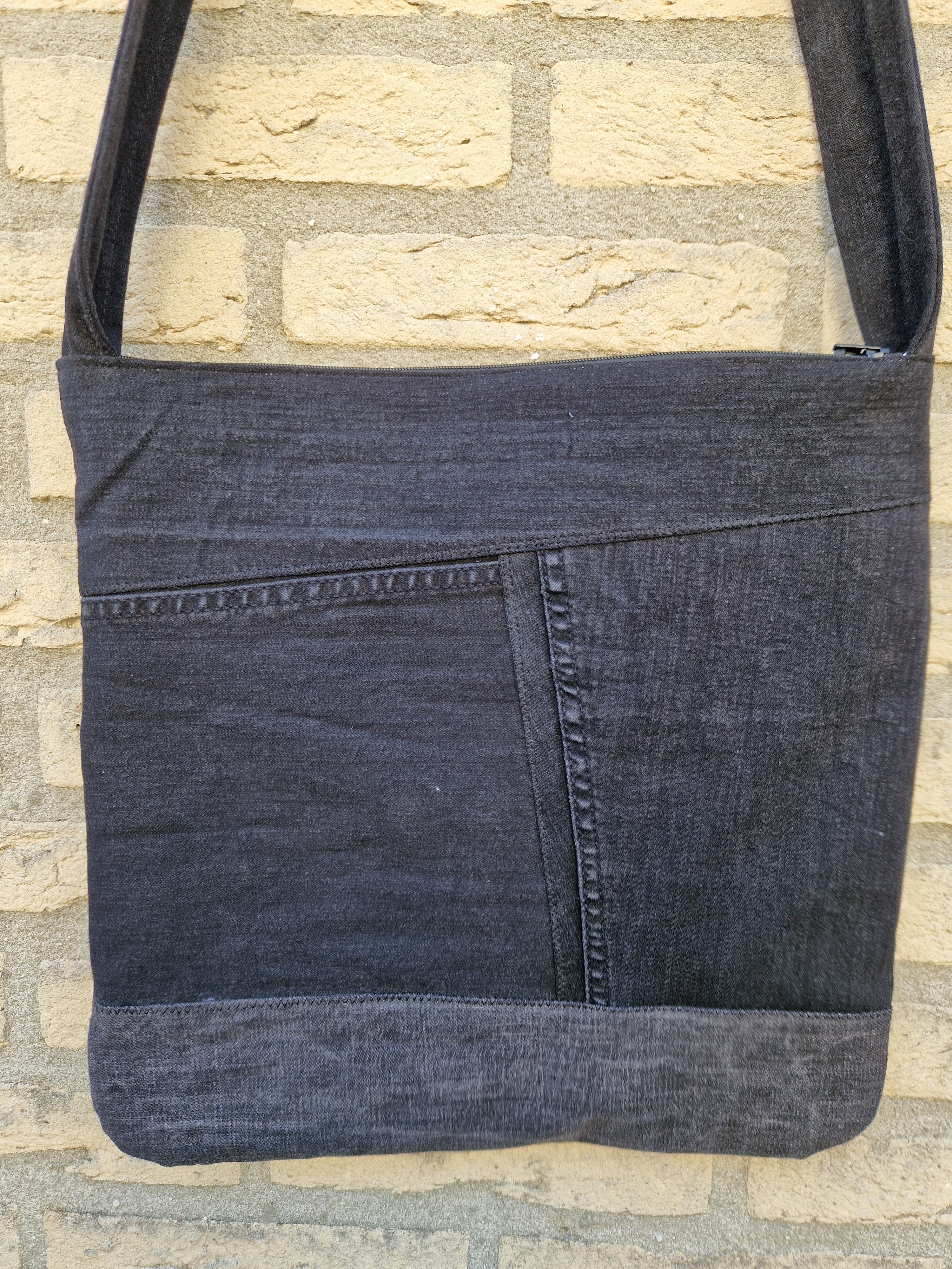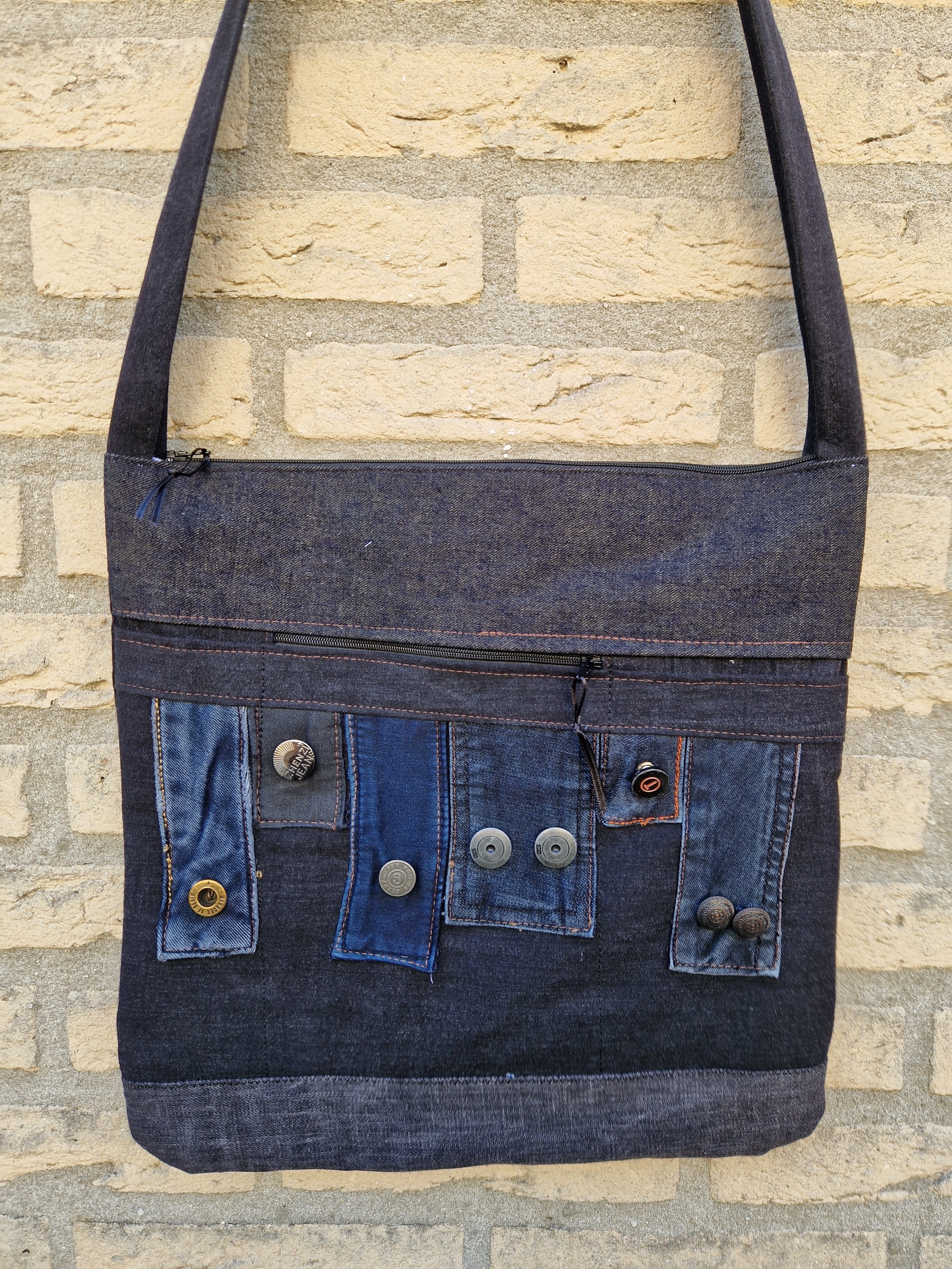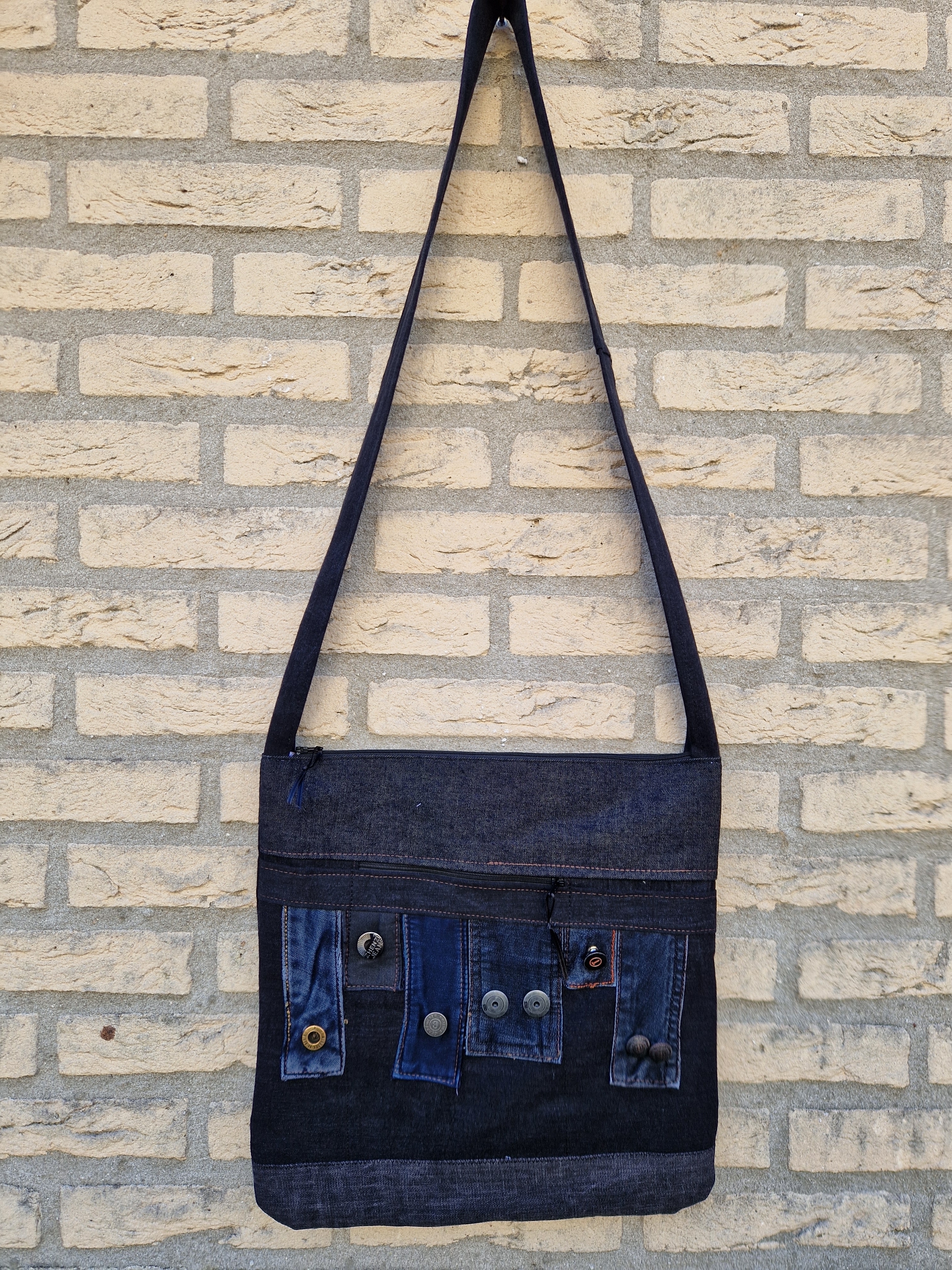 Tas (model crossover/ crossbody) gemaakt van verschillende soorten/ kleuren zwarte en grijze jeans, gecombineerd diverse knopen en knoopsgaten. Aan de voorkant een groot vak met ritssluiting (afmetingen: 15 cm breed x 20 cm hoog).