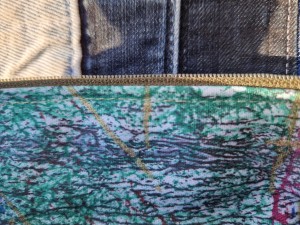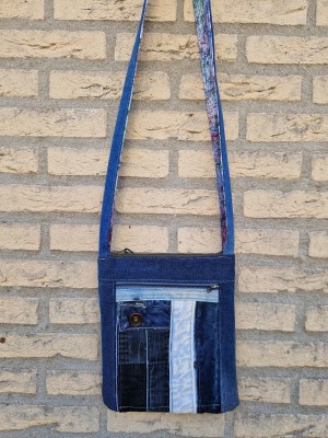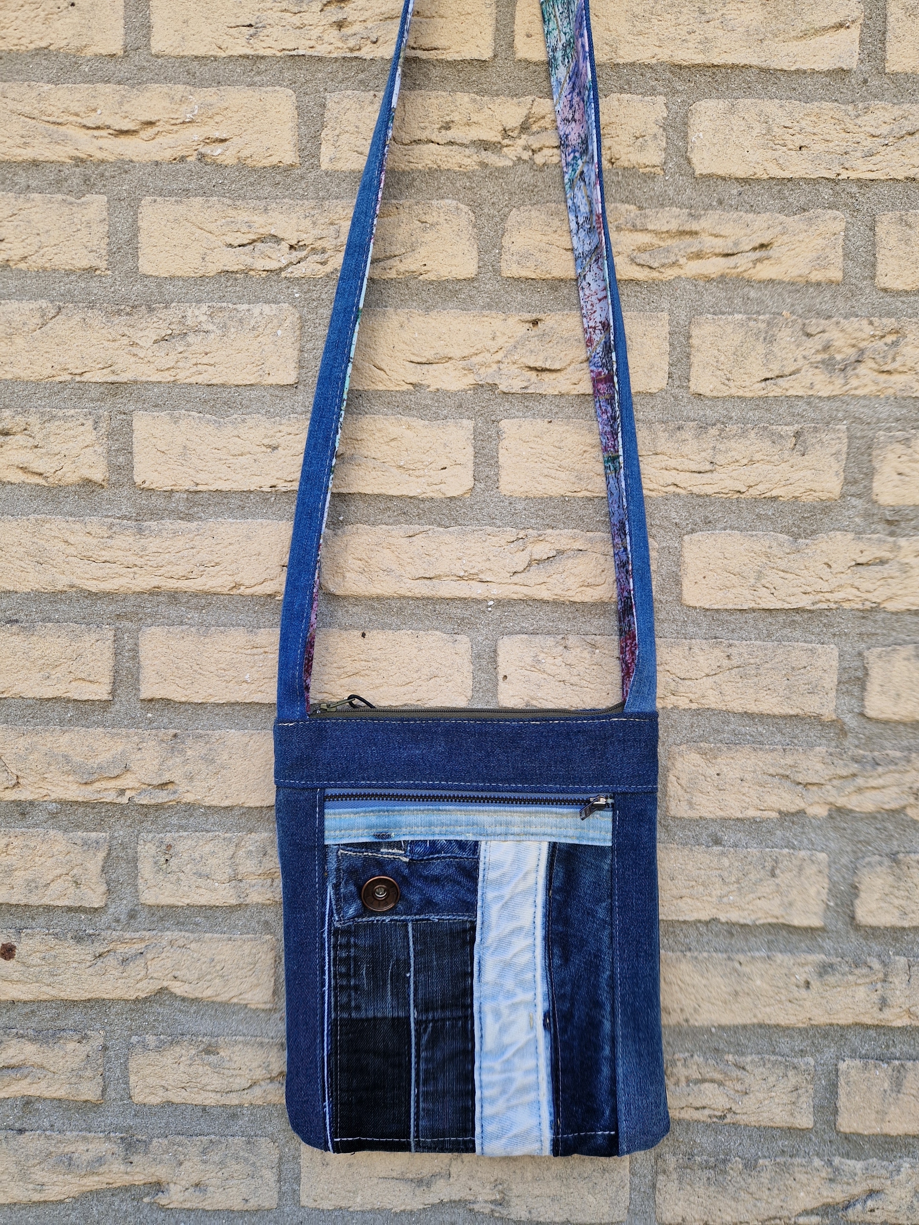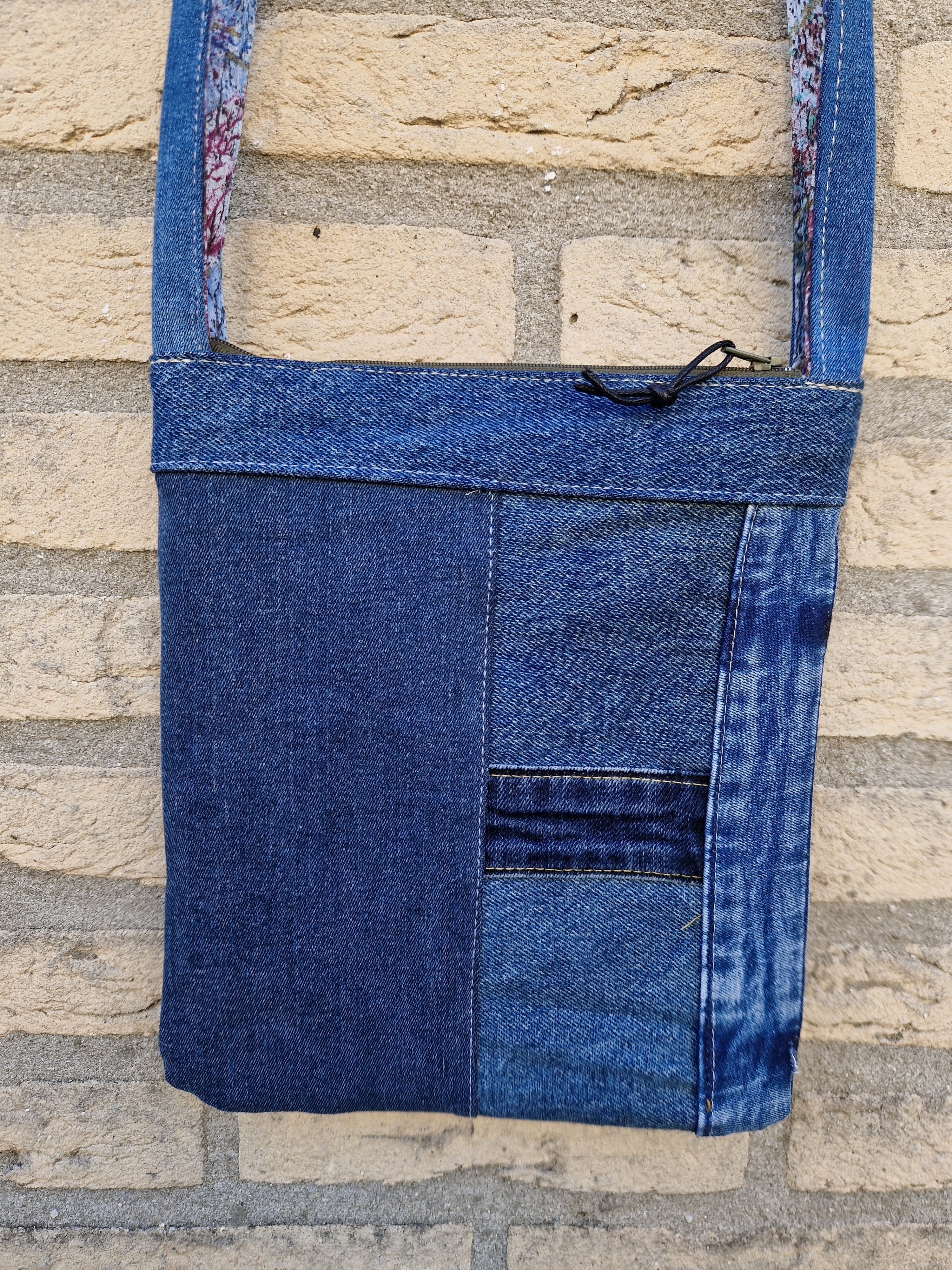 Crossovertas gemaakt van verschillende taille banden van diverse jeans. Aan de voorkant een groot vak met ritssluiting (afmetingen vak: 16 cm breed x 18,5 cm hoog).