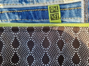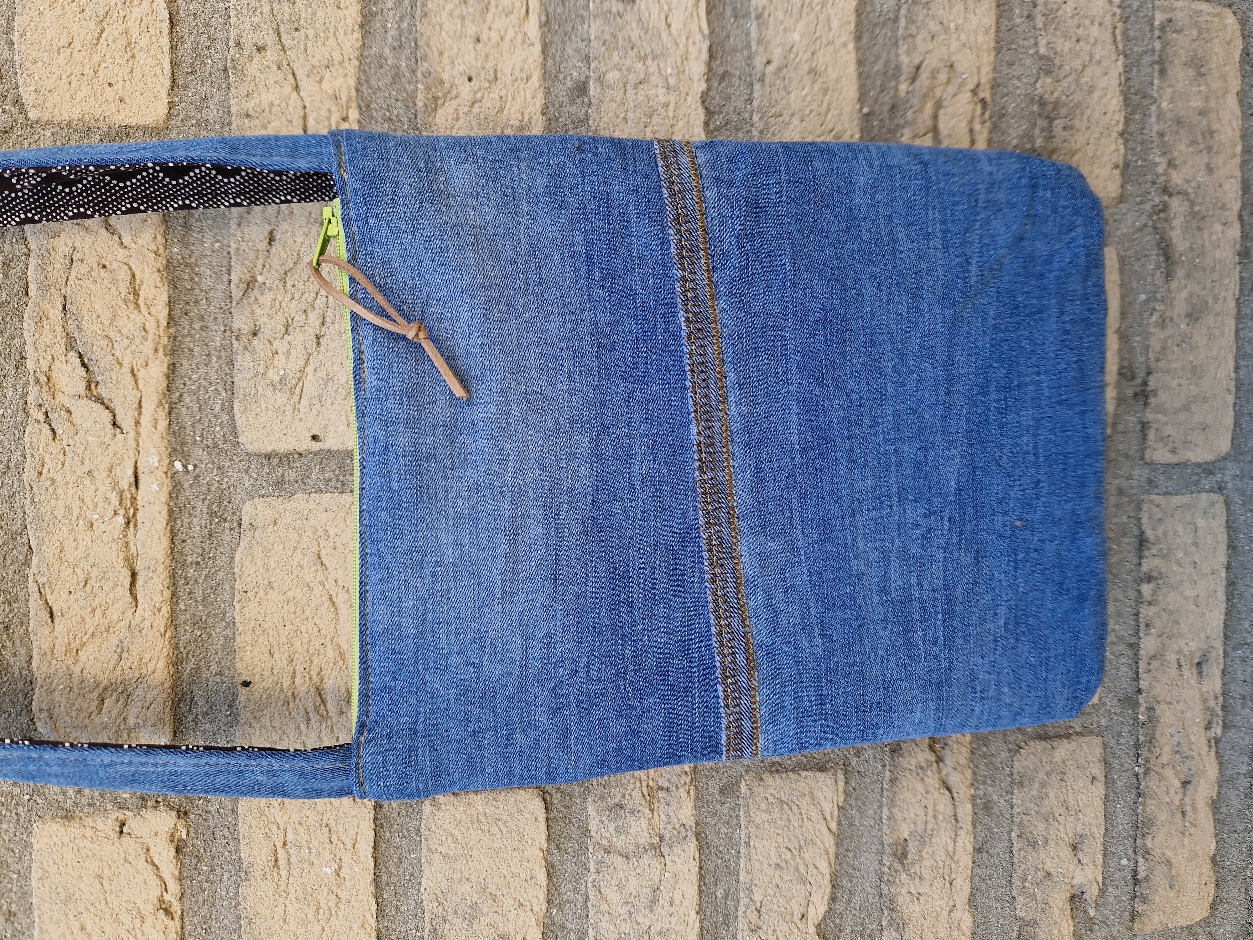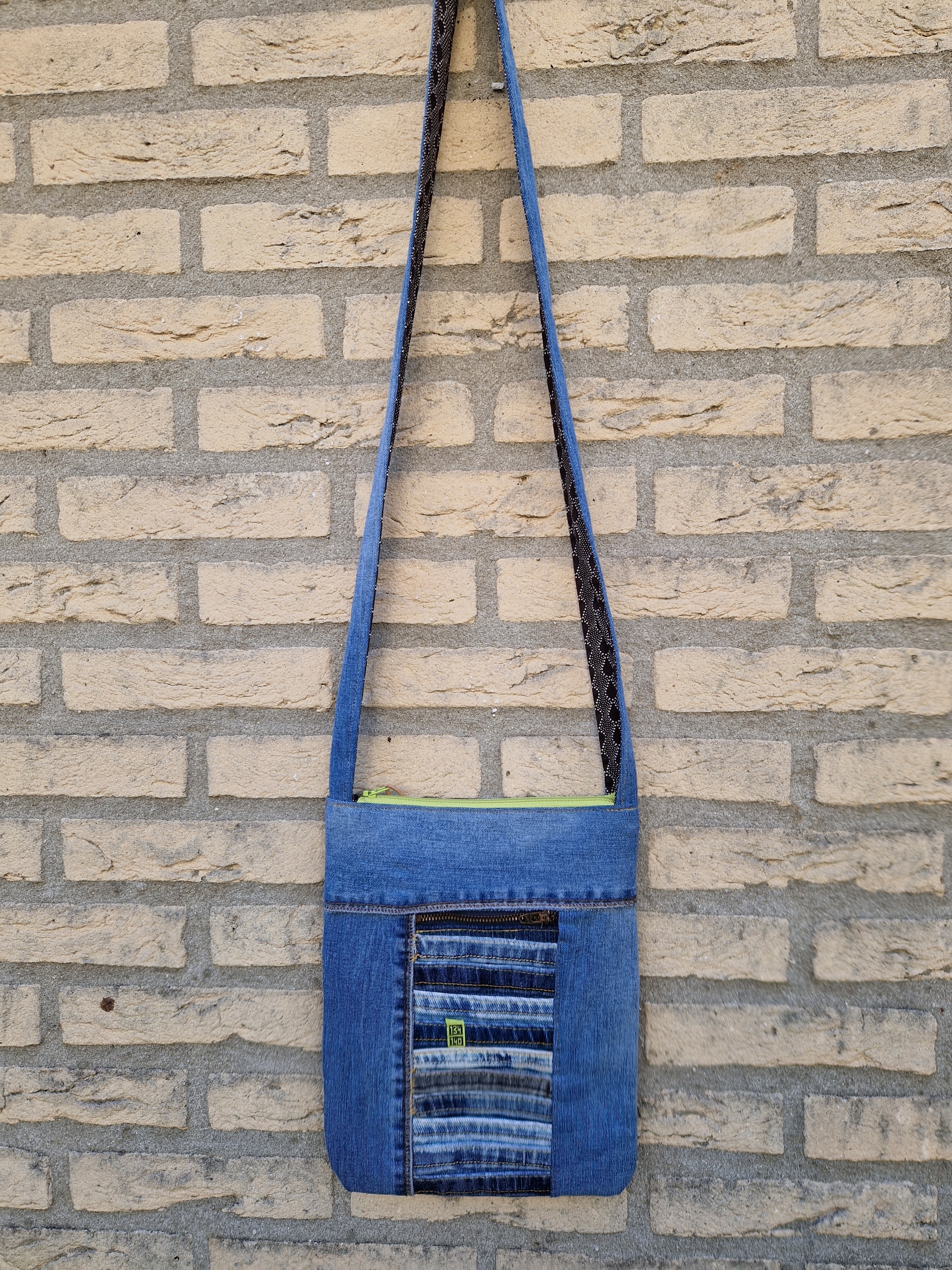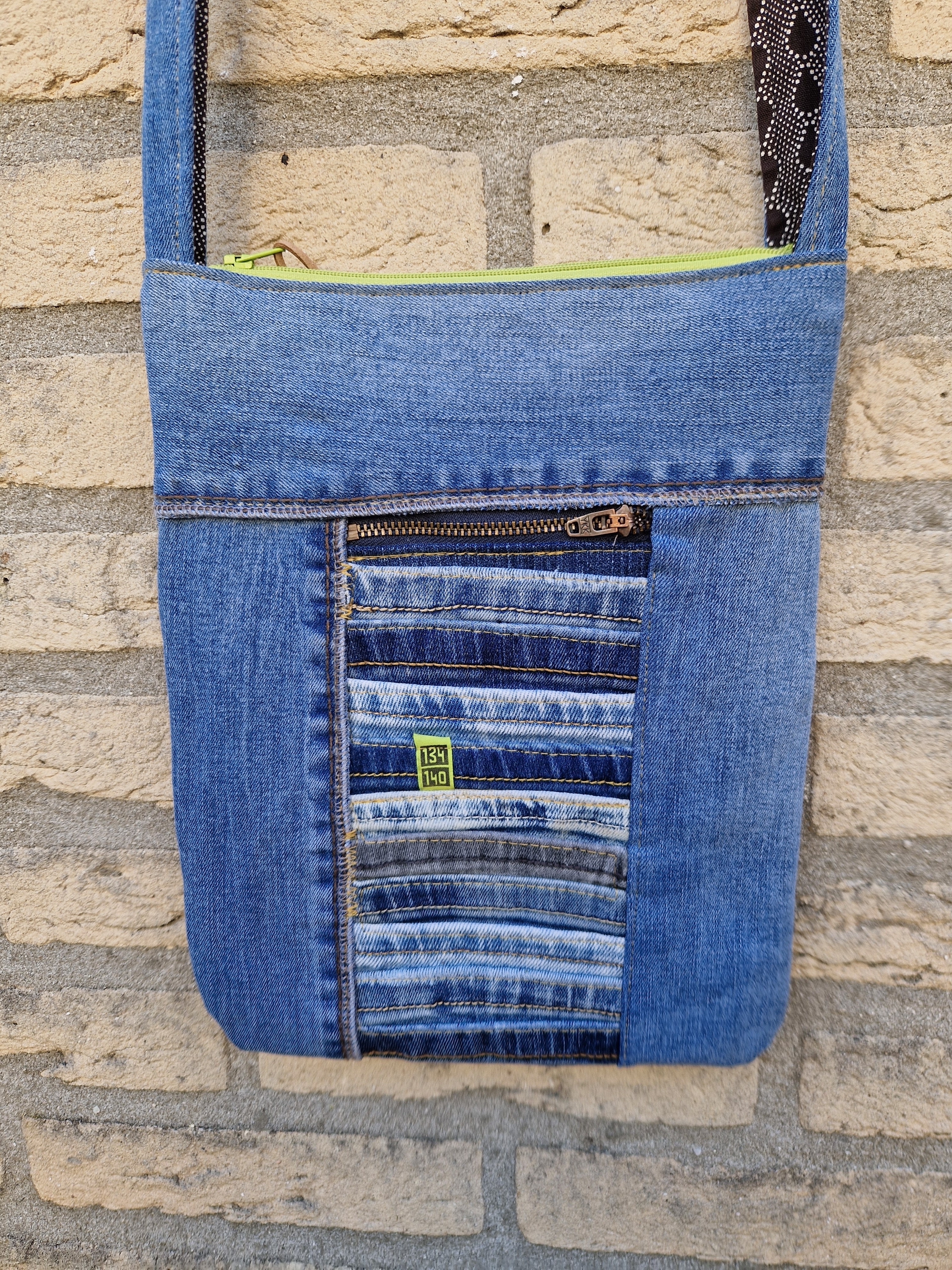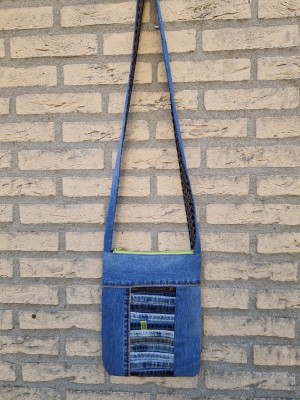 Kleine crossovertas gemaakt van een blauwe jeans, gecombineerd met broekrandjes in diverse kleuren. Aan de voorkant een klein vakje met ritssluiting (afmetingen: 10 cm breed x 9 cm hoog).
